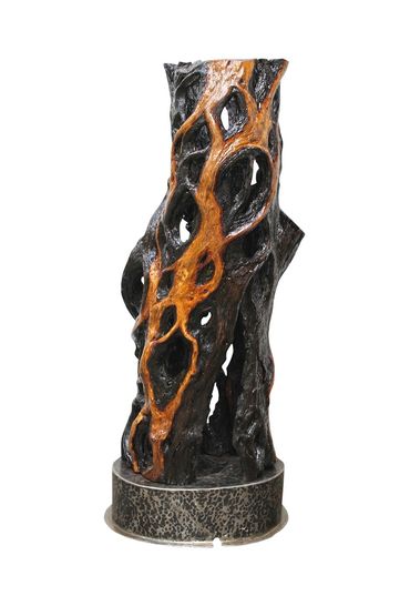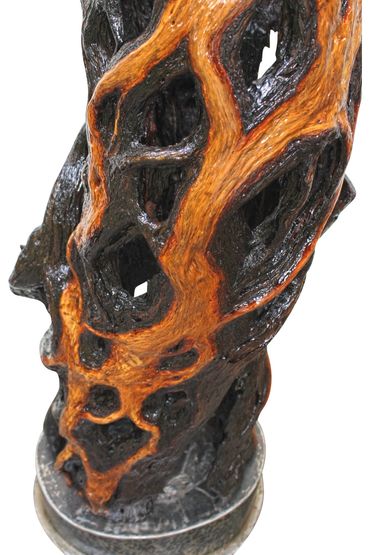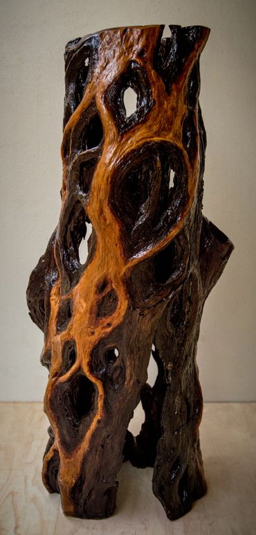 After oiling and varnishing the piece a wonderful pattern emerged (the contrast of the yellow on black wood) the lighter coloured wood against the dark background resembled flames running up a tree, this instantly made me of think of fire, flames running up the trunk, hence “The Flame Tree”